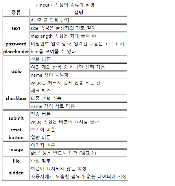 <caption><input> 속성의 종류와 설명</caption>