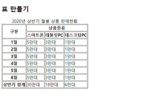 <caption>2020년 상반기 월별 상품 판매현황</caption>