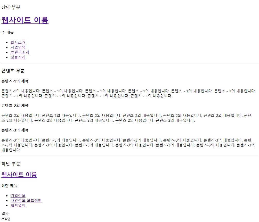 웹 사이트의 상단 부분, 콘텐츠 부분, 하단 부분 이와 같이 큰 덩어리로 3가지 영역을 기본으로 합니다.